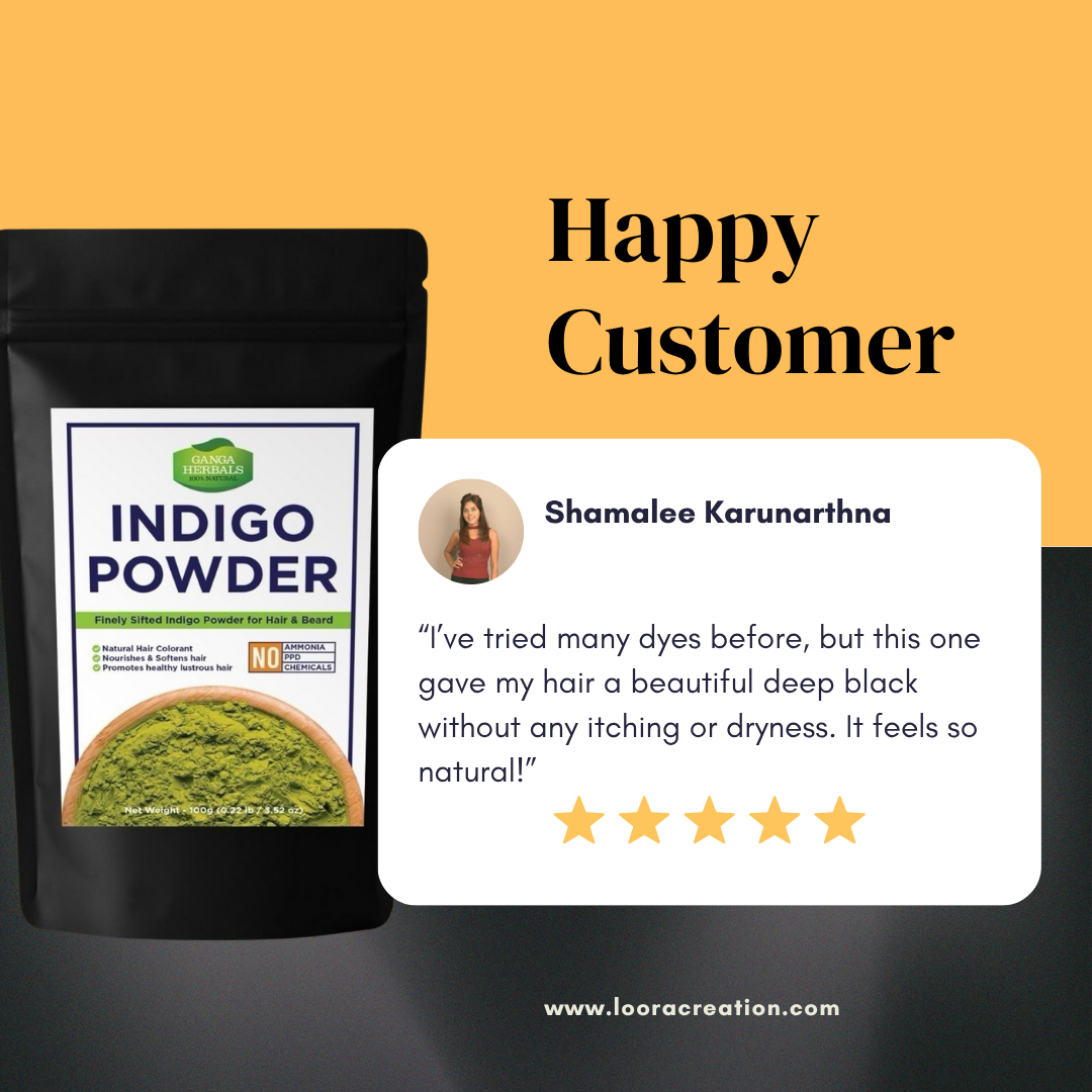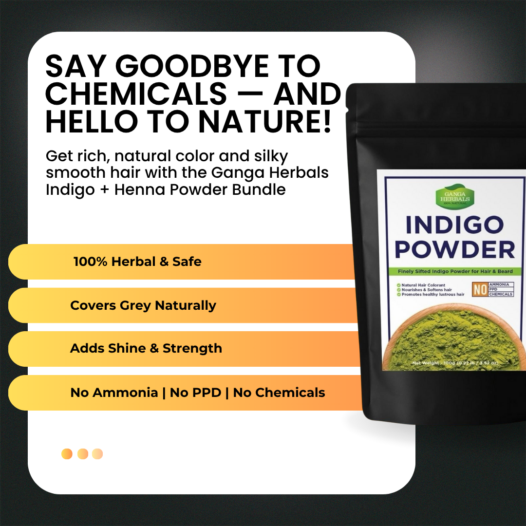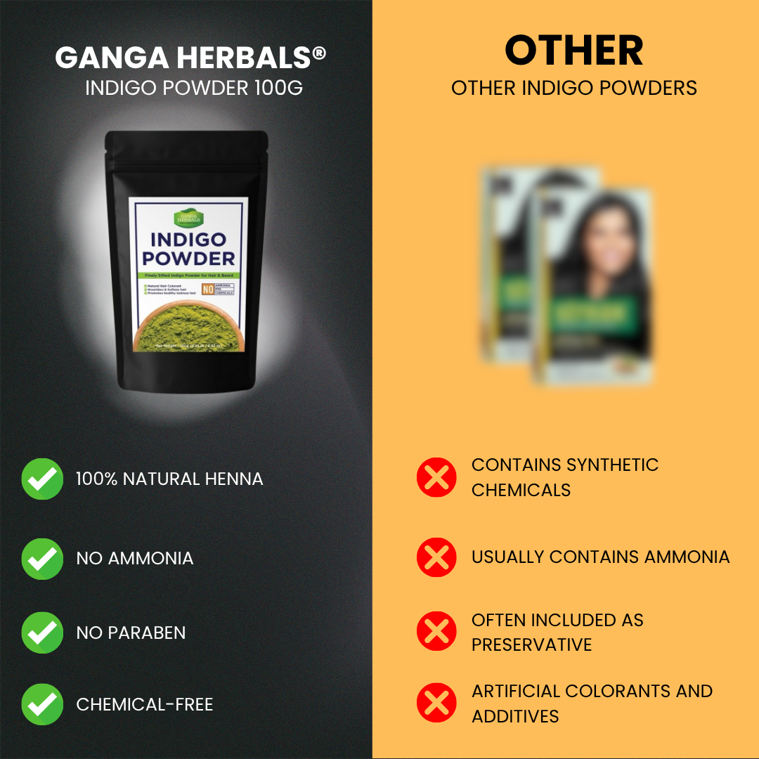 Unlike many commercial hair dyes that rely on harsh chemicals and artificial pigments, Ganga Herbals Indigo Powder is made from 100% pure indigo leaves with no added colors or preservatives. It doesn’t damage your hair or irritate the scalp — instead, it nourishes, strengthens, and gives a deep, natural black tone. While other products may provide quick color results, they often leave hair dry and brittle. Ganga Herbals focuses on purity and long-term hair health, offering a chemical-free, gentle, and eco-friendly alternative that keeps your hair naturally beautiful and healthy.